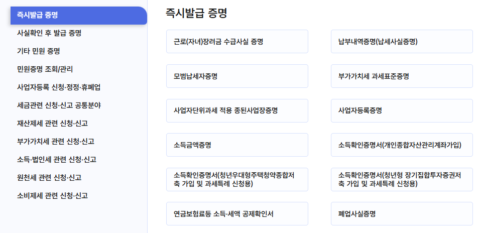 종합소득세를 신고하지 않았거나, 신고 내용이 아직 시스템에 반영되지 않은 경우에는 증명서 발급이 불가능합니다. 이 경우 세무서에 문의하거나 추후 다시 시도해야 합니다. - 외국인 발급 제한