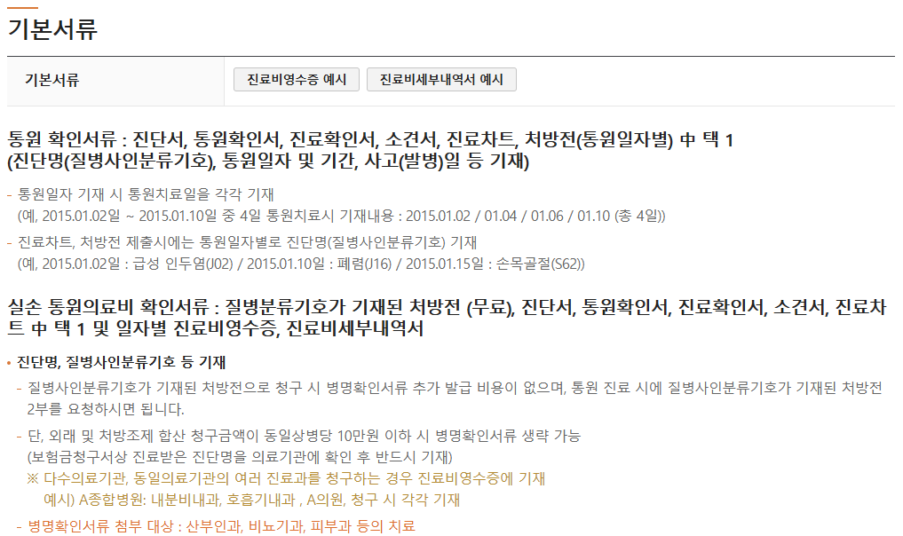 - 3만 원 초과 ~ 10만 원 이하: 보험금청구서, 병원 영수증, 질병 코드 포함 처방전