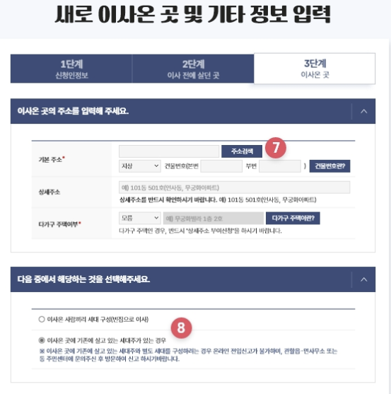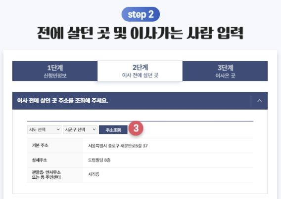 전입지와 전출지 주소를 도로명 주소 기준으로 입력합니다.