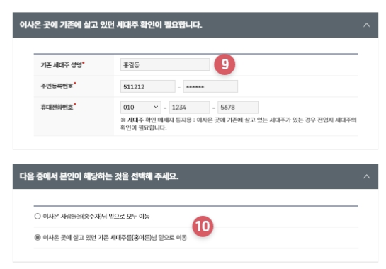 전입 유형(단독 전입, 가족과 함께 전입 등)을 선택한 후 세대주와의 관계를 설정합니다.