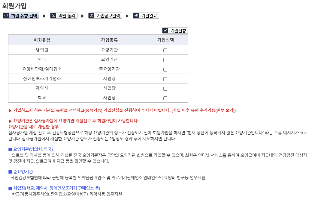 요양기관 정보마당을 이용하려면 먼저 회원가입이 필요합니다. 가입 대상은 요양기관의 대표자 또는 업무 담당자로, 공인인증서를 통해 본인 확인이 이루어져야 합니다.