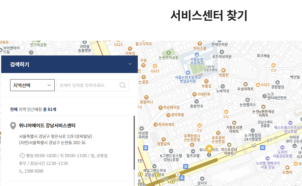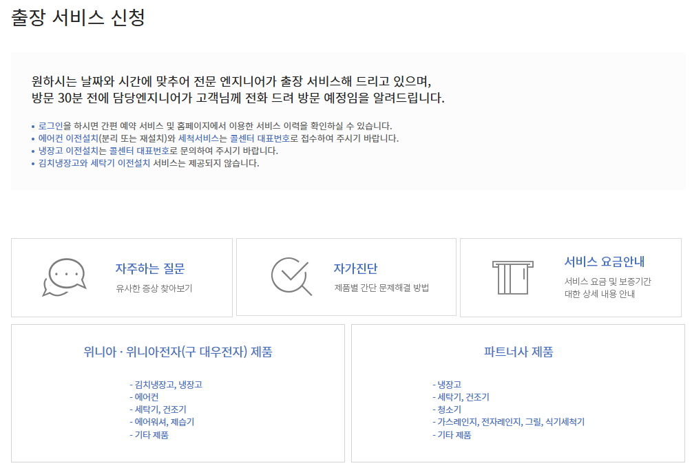인터넷 주소창에https://m.winiaaid.com을 입력하거나, ‘위니아에이드’로 검색해 모바일 페이지로 접속합니다. PC 버전도 지원되지만, 모바일 환경에 더 최적화되어 있습니다. - 출장 서비스 신청 클릭