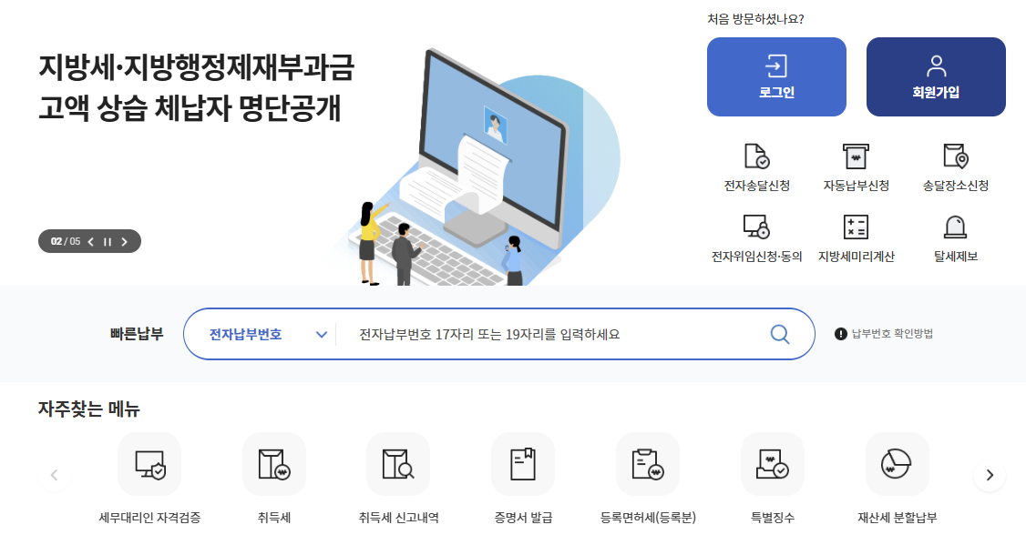 - 신고: 취득세, 등록면허세, 지방소득세 등을 신고할 수 있습니다.