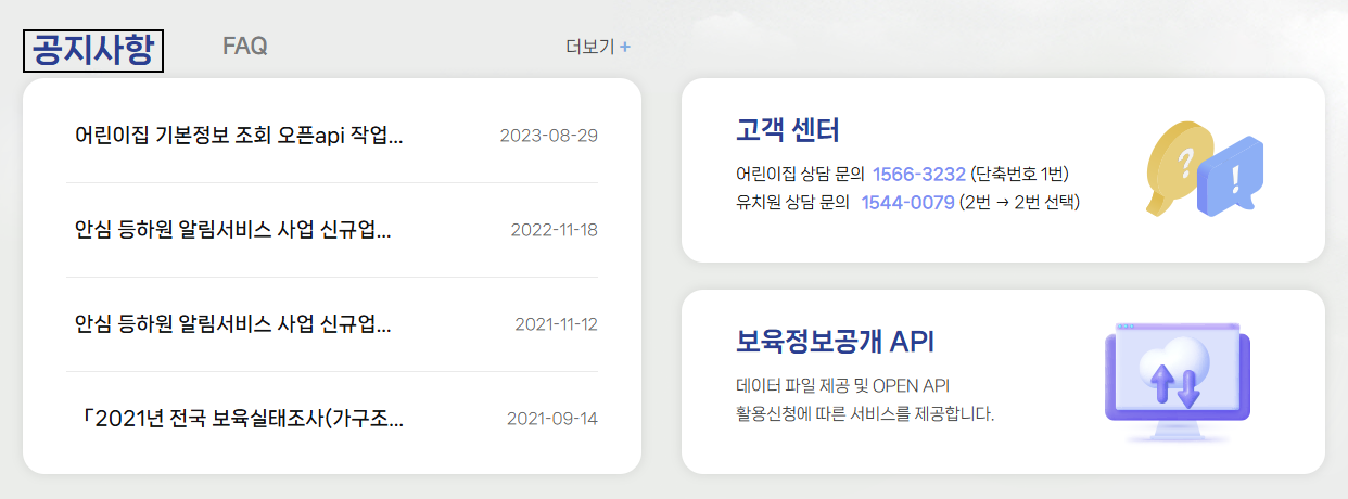 | 통합정보공시 | 유치원·어린이집 통합 검색, 조건 필터, 비교 기능 | 유치원+어린이집 |