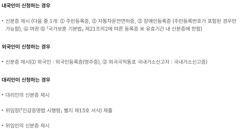 | 대리인 발급 시 위임장 | 대리 발급 시 본인의 서명과 인감 날인이 포함된 위임장 필요 |