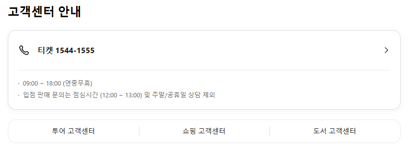 고객센터는 공연, 스포츠 경기, 전시회 등 티켓 구매 관련 문제를 해결하고, 고객이 원하는 정보를 신속하게 제공합니다. 전화 상담은 정해진 운영 시간에만 가능하지만, 자동화된 서비스를 통해 시간 제약 없이 기본적인 문제를 해결할 수 있습니다.