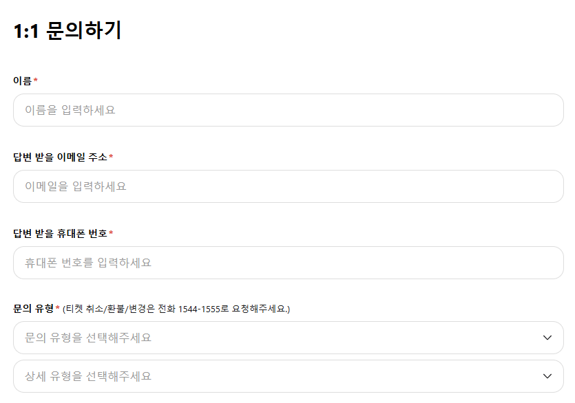 인터파크 티켓 홈페이지나 앱에서 ‘1:1 문의하기’ 기능을 이용하면 비대면으로 문제를 해결할 수 있습니다.