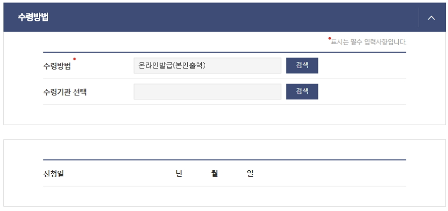 간단한 민원 신청서를 작성한 뒤, 필요한 경우 수수료를 납부합니다. 대리인이 발급받을 경우 위임장과 대리인의 신분증이 필요합니다. - 즉시 발급 및 출력 수령