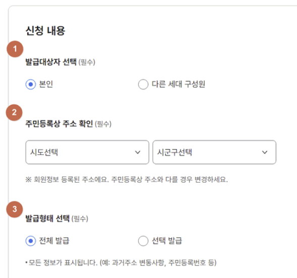 발급 신청서 작성 단계에서는 초본에 표시할 항목을 선택할 수 있습니다. 예를 들어, 주소 이동 기록을 포함할지 여부, 세대원 관계를 표시할지 여부 등을 선택하여 필요 사항만 포함된 초본을 만들 수 있습니다. 선택한 항목은 발급된 초본에만 표시되며, 불필요한 정보는 제외할 수 있어 편리합니다.