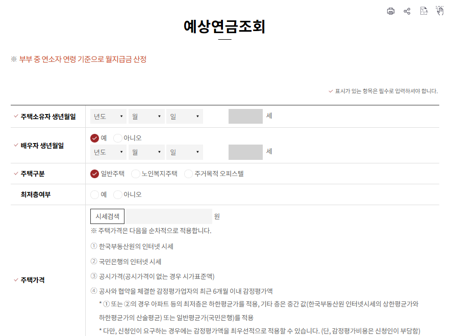 공시가격은 가입 가능 여부 판단에 중요하지만, 월지급금은 시세 또는 감정평가액에 따라 산정됩니다. - 종신지급방식 정액형부터 먼저 넣어봅니다.