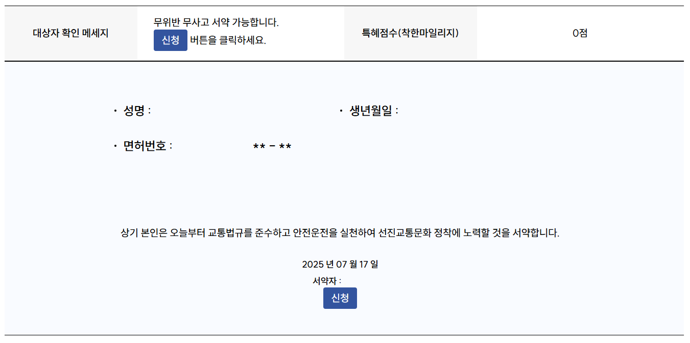 - 무사고·무위반 서약 확인: 서약서 내용을 충분히 읽고, '서약하기' 버튼을 클릭합니다.