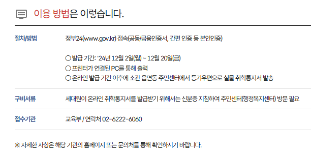 A4: 온라인 발급 기간 이후에는 소관 읍면동 주민센터에서 등기우편으로 실물 취학통지서를 발송하므로, 해당 주민센터에 문의하시기 바랍니다.
