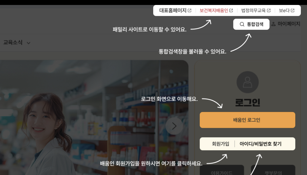 브라우저에서 ‘KOHI 의무교육’ 또는 ‘한국보건복지인재원’을 검색한 뒤, 공식 홈페이지에 접속합니다. 상단의 ‘회원가입’ 메뉴를 클릭해 일반 회원 또는 간편 로그인(Kakao, 네이버 등) 중 원하는 방식으로 가입을 진행합니다.