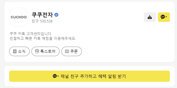 쿠쿠는 카카오톡 공식 채널을 통해 실시간 상담 서비스를 제공하고 있습니다.