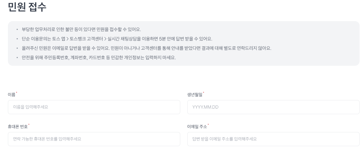 | 토스뱅크 앱 내 고객센터 | 토스뱅크 앱에서 바로 접속 가능한 고객센터로, 실시간 채팅 상담을 제공 |