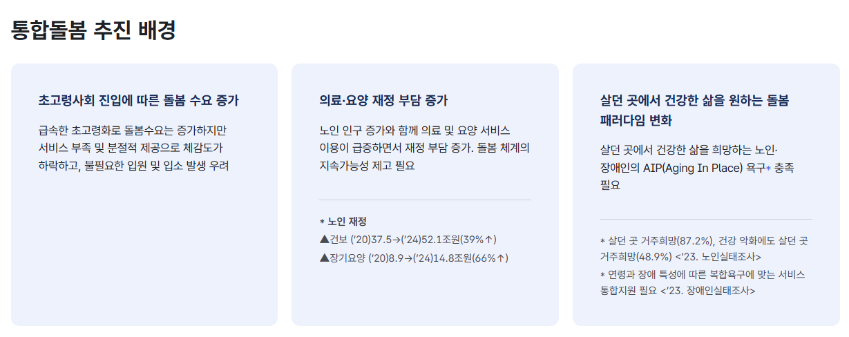 특히 최근에는 지역에서 의료와 요양, 돌봄을 통합적으로 연계하는 체계가 본격적으로 자리 잡고 있어서, 예전처럼 제도별로 따로 알아보는 방식보다 한 번 신청하고 조사와 계획 수립을 거쳐 필요한 서비스를 연결받는 흐름이 중요해졌습니다. 지금은 단순히 돌봄 서비스를 하나 신청하는 차원이 아니라, 개인 상황에 맞는 복합 지원을 연결받는 방식으로 이해하시는 것이 더 정확합니다.