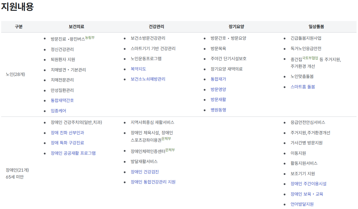 | 유의할 점 | 지역별 서비스 내용 차이 가능 | 같은 제도라도 실제 제공 서비스는 지자체별로 다를 수 있음 |