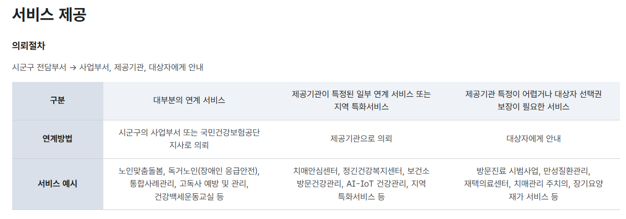 - 계획에 따라 의료, 요양, 돌봄, 주거, 식사, 이동 등 필요한 서비스가 연계됩니다.