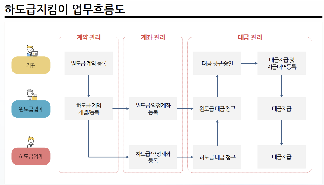 건설업과 제조업 등 여러 산업에서 하도급 계약이 이루어지는 경우가 많습니다. 하지만 원도급업체와 하도급업체 간 대금 지급 과정에서 지급 지연, 중간 단계에서의 유용, 불투명한 정산 문제 등이 발생할 수 있어 이를 관리하는 시스템이 필요합니다. 이를 해결하기 위해 정부에서는 하도급지킴이 시스템을 운영하고 있으며, 이를 통해 하도급 대금을 투명하게 지급하고 관리할 수 있습니다.