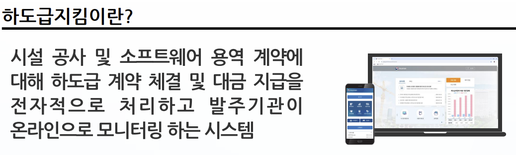 하도급지킴이 시스템은 공정거래와 투명한 하도급 대금 지급을 목적으로 운영되는 전자 시스템입니다. 이 시스템은 원사업자와 하도급업체 간의 계약 및 대금 지급 과정을 투명하게 관리하며, 건설 및 제조업 등 다양한 업종에서 공정한 하도급 거래 문화를 확립하기 위해 개발되었습니다. 이를 통해 하도급업체와 근로자는 안정적인 대금 지급을 보장받을 수 있으며, 기업 간 신뢰를 바탕으로 상생 협력을 강화할 수 있습니다.