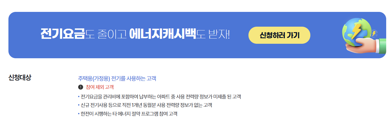 기본적으로 주택용 고객이라면 대부분 신청이 가능하지만, 전기사용량 비교 기준이 있어야 하므로 사용 이력이 없는 신규 가입자는 다음 연도부터 참여할 수 있습니다.