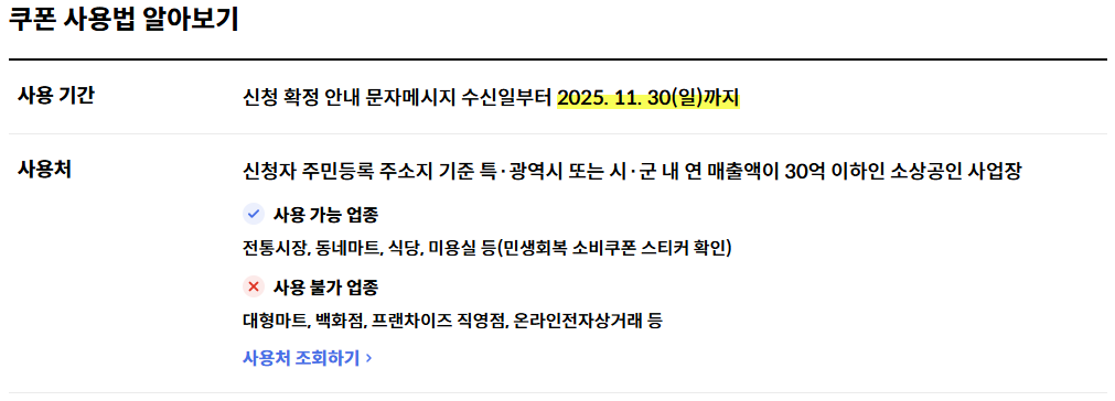 | 사용처 | 전통시장, 동네마트, 병원, 약국, 음식점 등 소상공인 업종 |