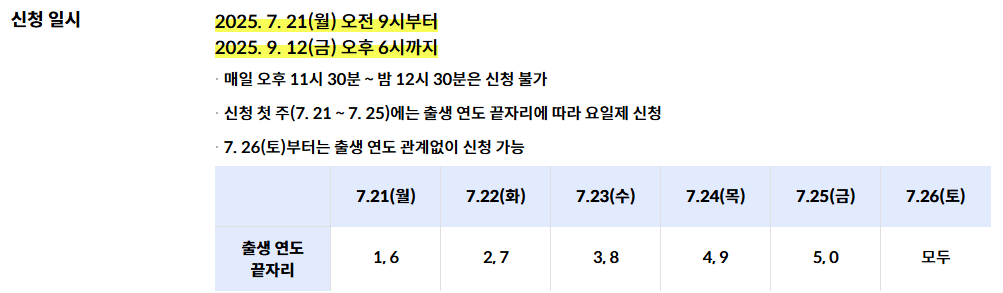 신청 기간은 2025년 7월 21일(월) 오전 9시부터 9월 12일(금) 오후 6시까지입니다. 초기 일주일은 신청자가 몰릴 것을 대비해 ‘5부제 신청제도’를 도입하여 운영했으며, 출생연도 끝자리에 따라 신청 요일이 나뉘었습니다. 하지만 7월 26일부터는 모든 국민이 자유롭게 신청할 수 있도록 변경되었기 때문에, 아직 신청하지 않으신 분들도 충분히 혜택을 누릴 수 있습니다.