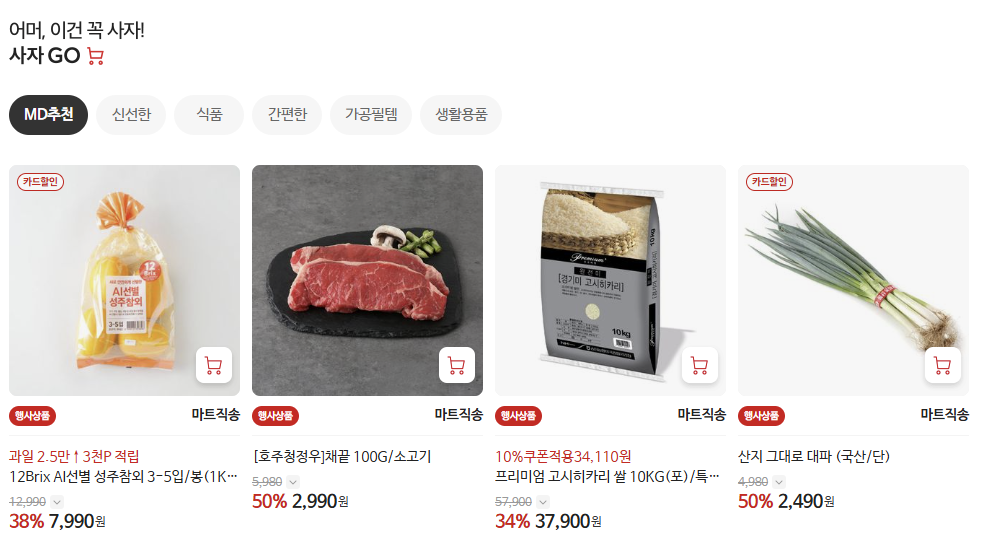 | 주요 카테고리 | 신선식품, 가공식품, 생활용품, 가전, 패션, 유아동, 반려동물 용품 등 |