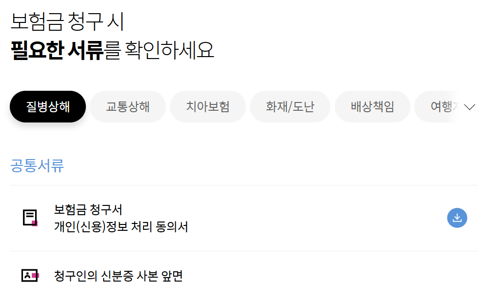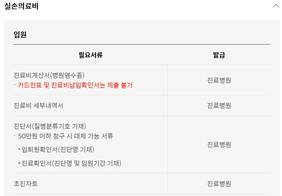 | 필수 서류 | 보험금 청구서, 개인정보 동의서, 신분증/통장 사본, 진료비 영수증, 진단서 등 |
