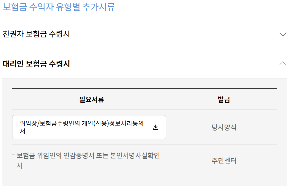 또한 대리인이 청구하는 경우에는 위임장과 함께 환자의 인감증명서 및 인감도장이 날인된 동의서도 추가로 제출해야 합니다. 자녀나 고령자 명의로 된 보험인 경우 가족 관계를 입증할 수 있는 주민등록등본이나 가족관계증명서를 요구받는 경우도 있습니다.