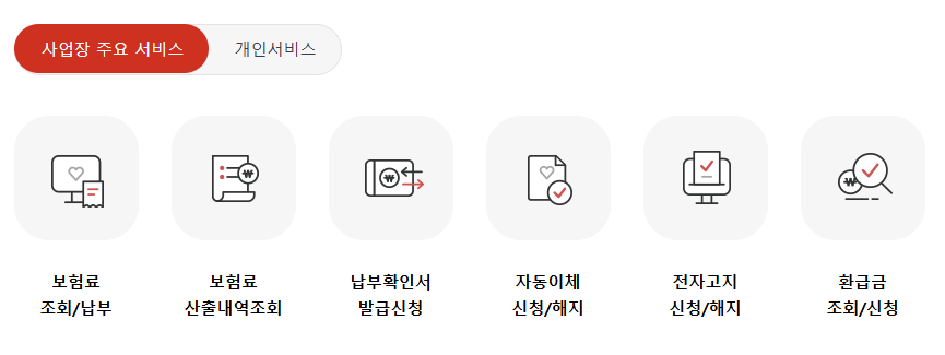 로그인을 해야 하는데, 개인 사용자라면 공동인증서(구 공인인증서)나 간편인증(카카오, PASS 등) 중 선택하실 수 있습니다. 사업자인 경우에는 사업자용 공동인증서를 이용해 로그인하시면 됩니다. 로그인 후에는 가입된 사업장의 정보가 자동으로 조회되며, 발급 가능한 보험 항목을 확인할 수 있습니다.