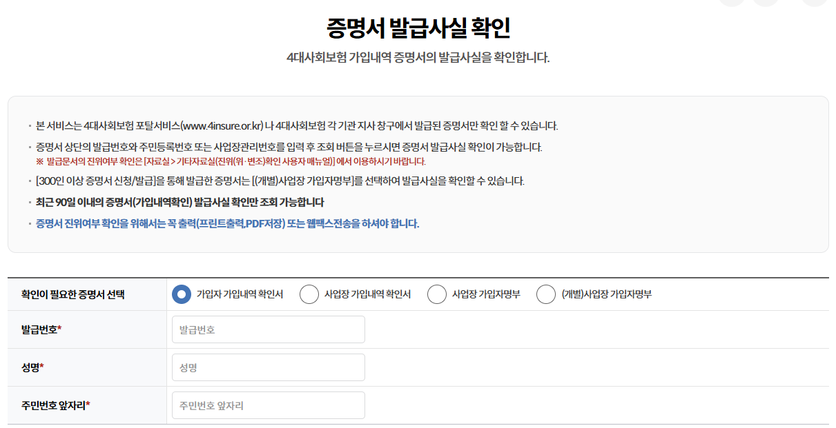 | 4 | 증명서 신청 클릭 → 각 기관(연금, 건강, 고용, 산재)의 상태 확인 |