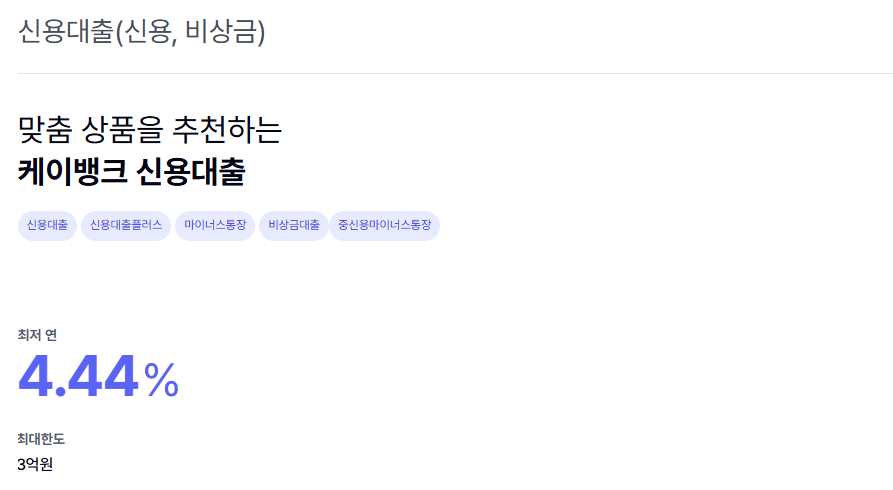 K뱅크는 개인 신용대출, 마이너스 통장 대출, 전세 자금 대출 등의 상품을 제공하여 고객의 다양한 금융 수요를 충족합니다. K뱅크는 금리와 한도가 매일 변동하므로, 실시간으로 조건을 확인하는 것이 중요합니다.