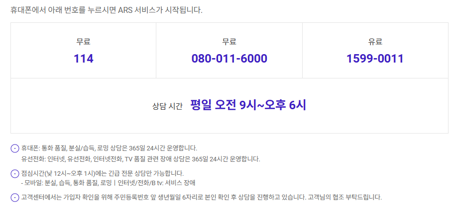 | 휴대폰 고객센터 | 080-011-6000 | 무료번호로 휴대폰 상담이 필요할 때 |