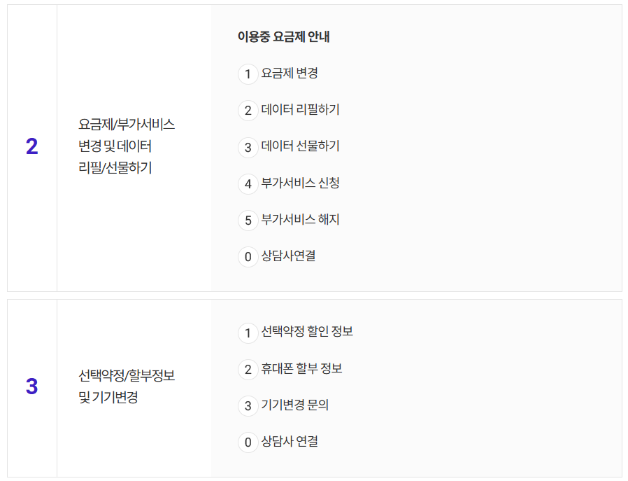| 다이렉트샵 | 1525 / 1599-0111 | 온라인 가입, 구매 상담 관련 문의 |