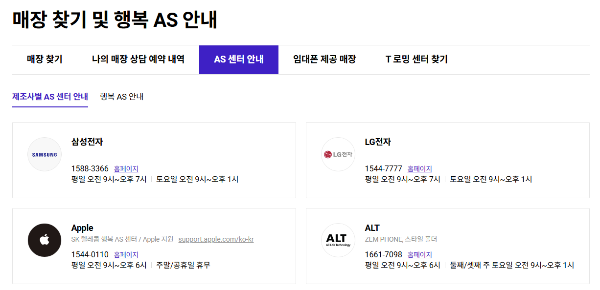 단말기 고장이나 수리는 행복 AS 번호를 보는 것이 더 빠릅니다